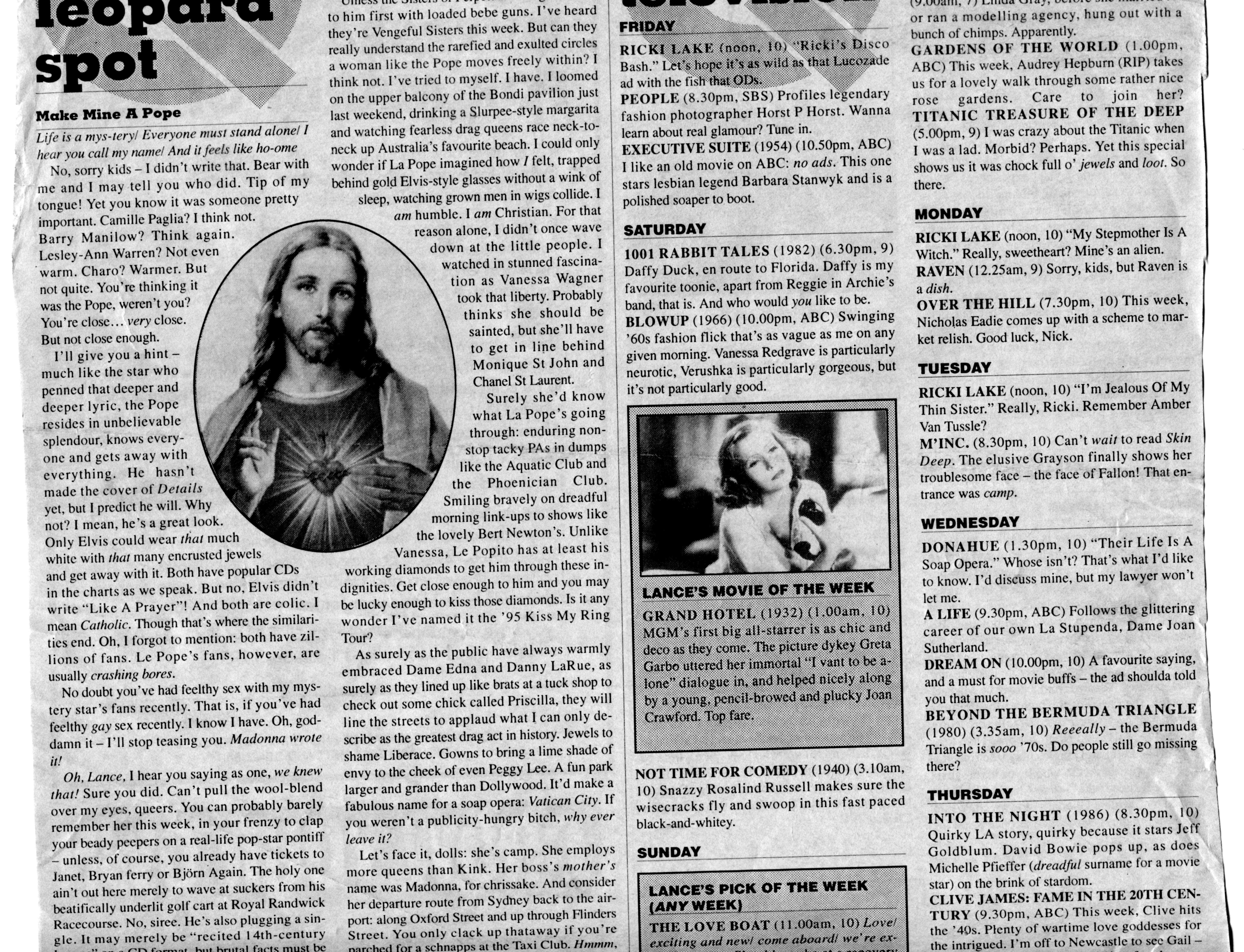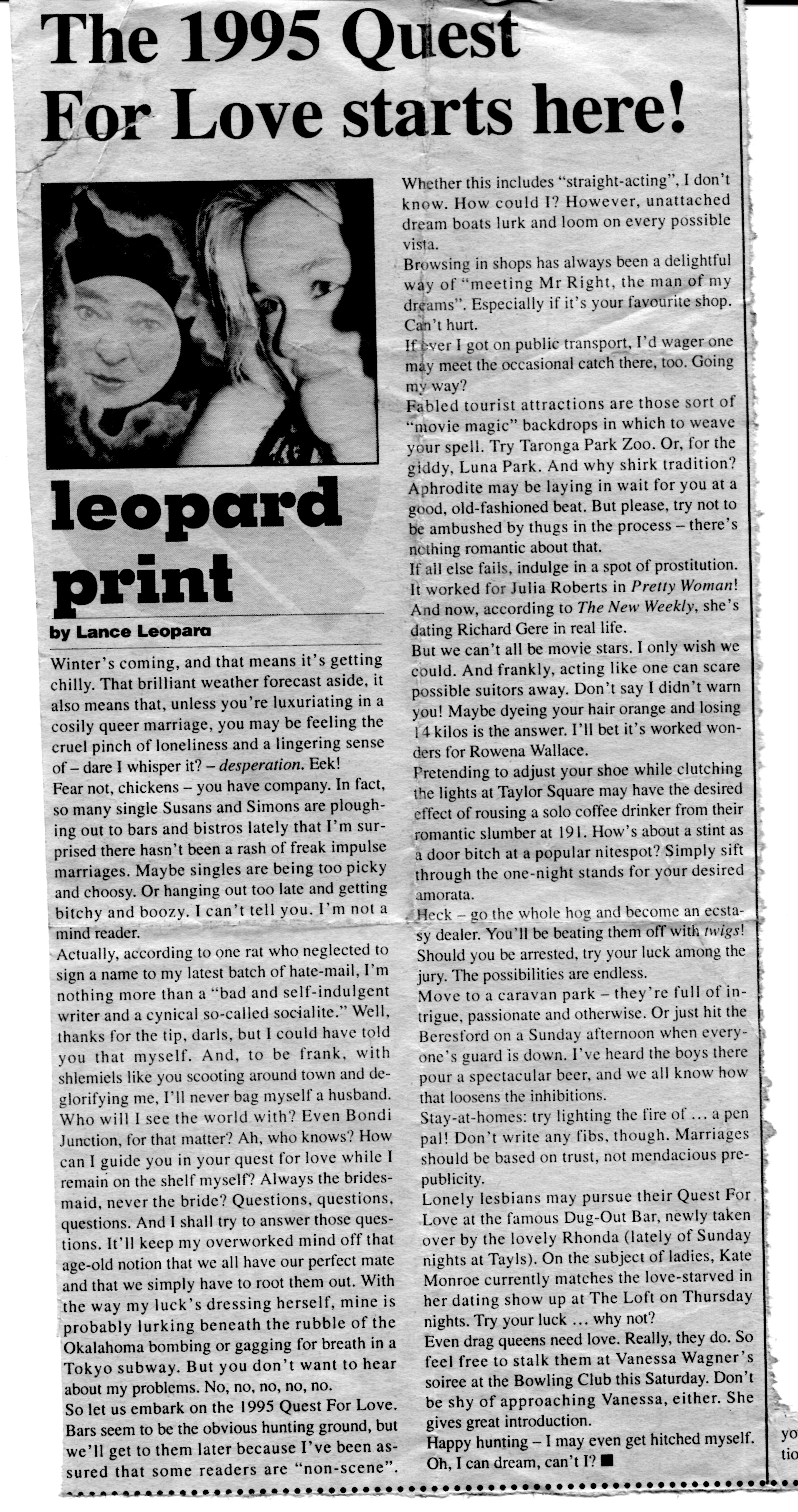 I used to look forward to reading Lance’s columns every fortnight, it was such a highlight. They were in On The Street, Capital Q, the Sydney Star Observer (6 June 1996 to 18 Sept 1997), then back to Capital Q. I had been a journalist since the early 1980s and was totally blown away by Lance Leopard’s stream-of-consciousness columns and his chatty style and I cut them out as they were very inspiring. Over time, Lance’s writings gave me a vision of how I could write about the everyday social events I attended. He could make a trip to the convenience store next to the Taxi Club at midnight sound hilarious. He was a witty gossip writer who truly captured the 1990s GLBTIQA+ social scene.