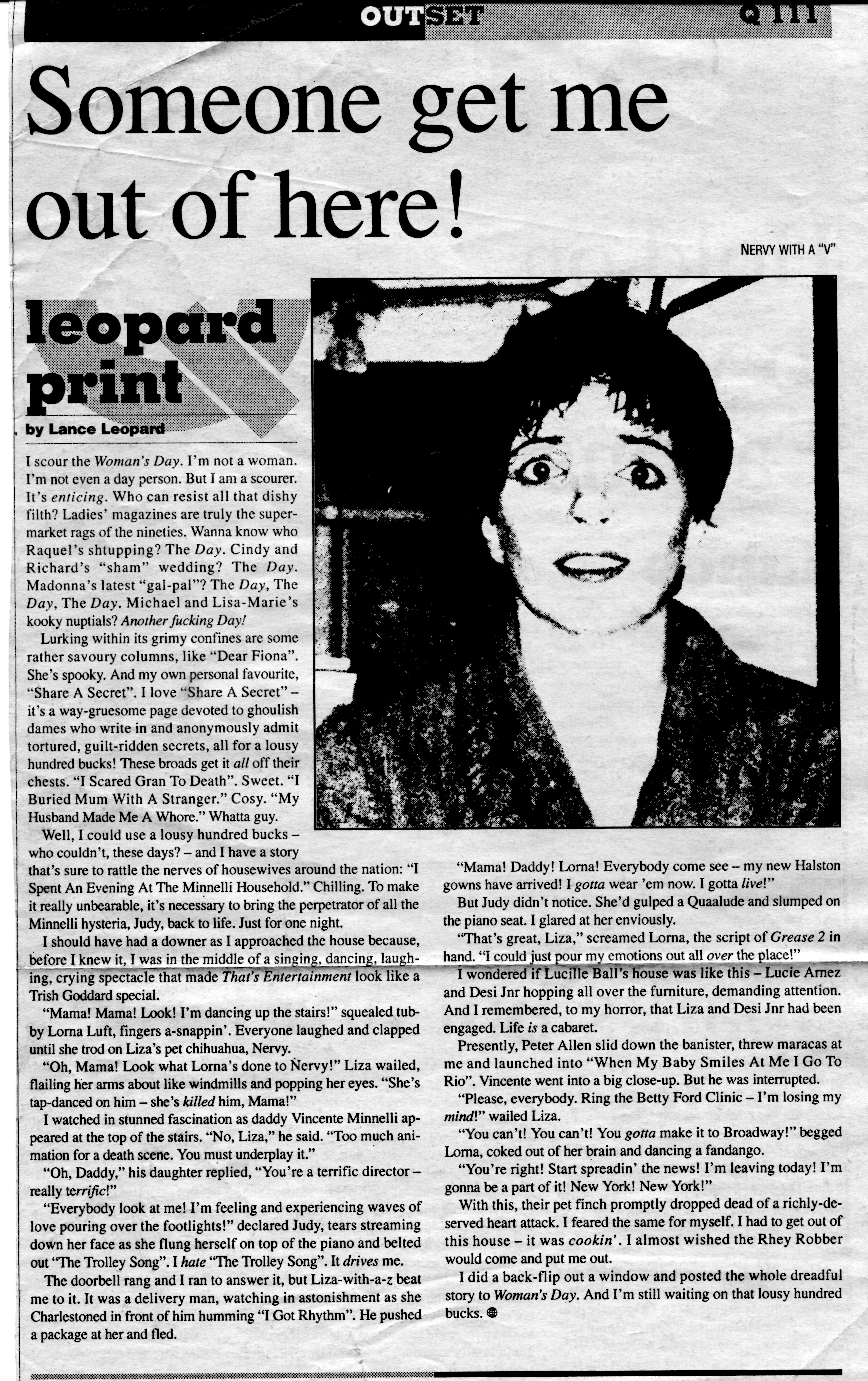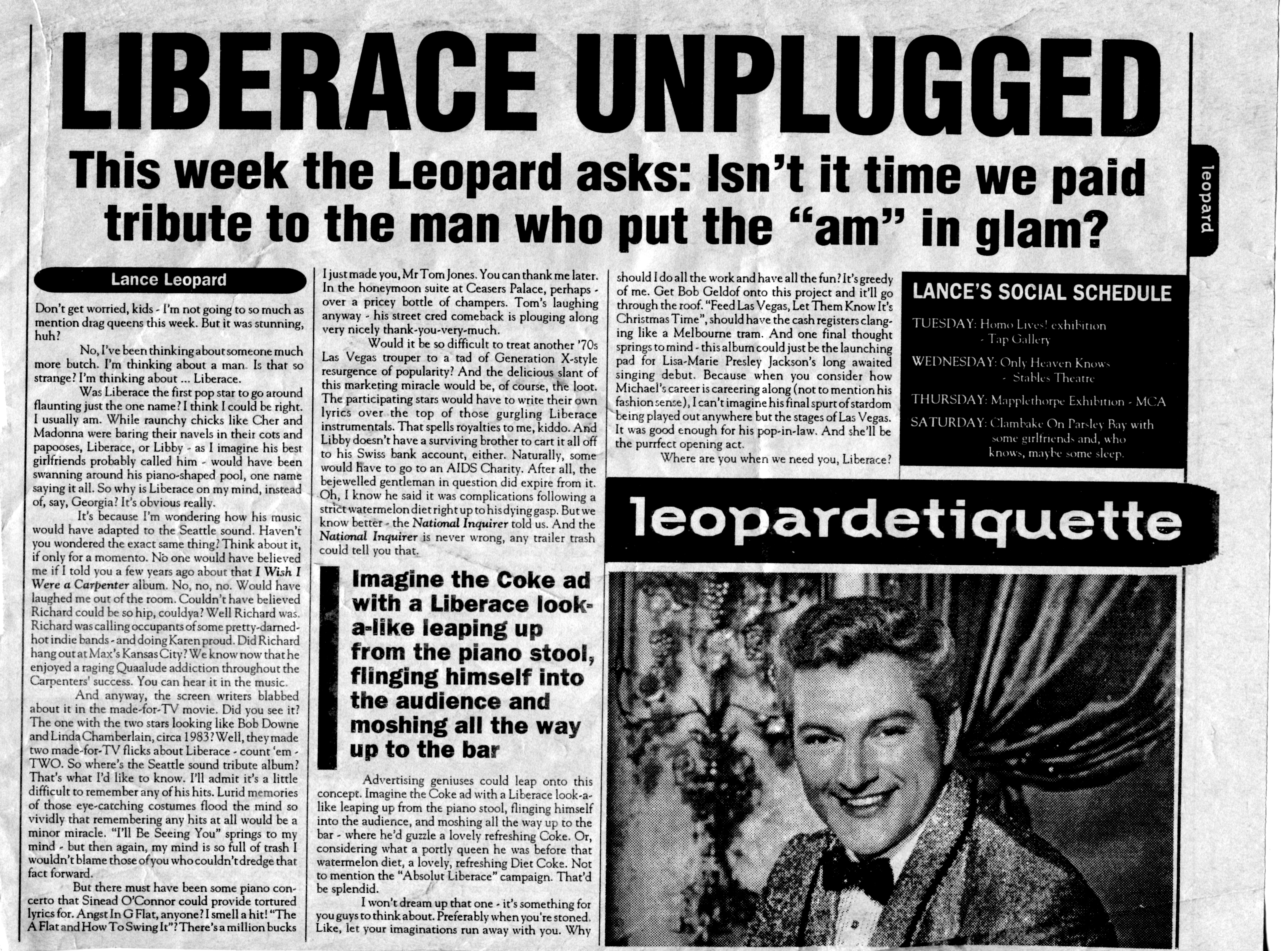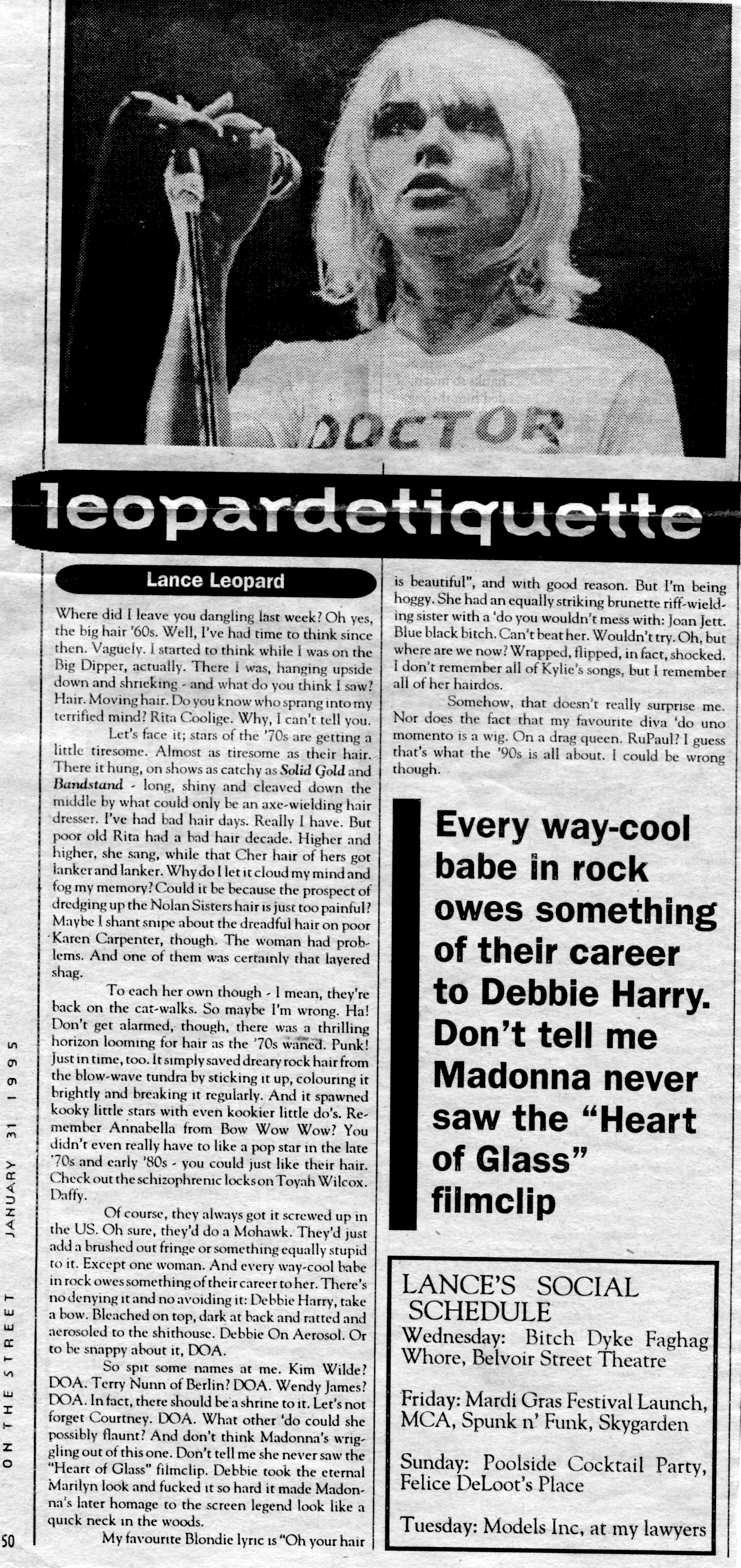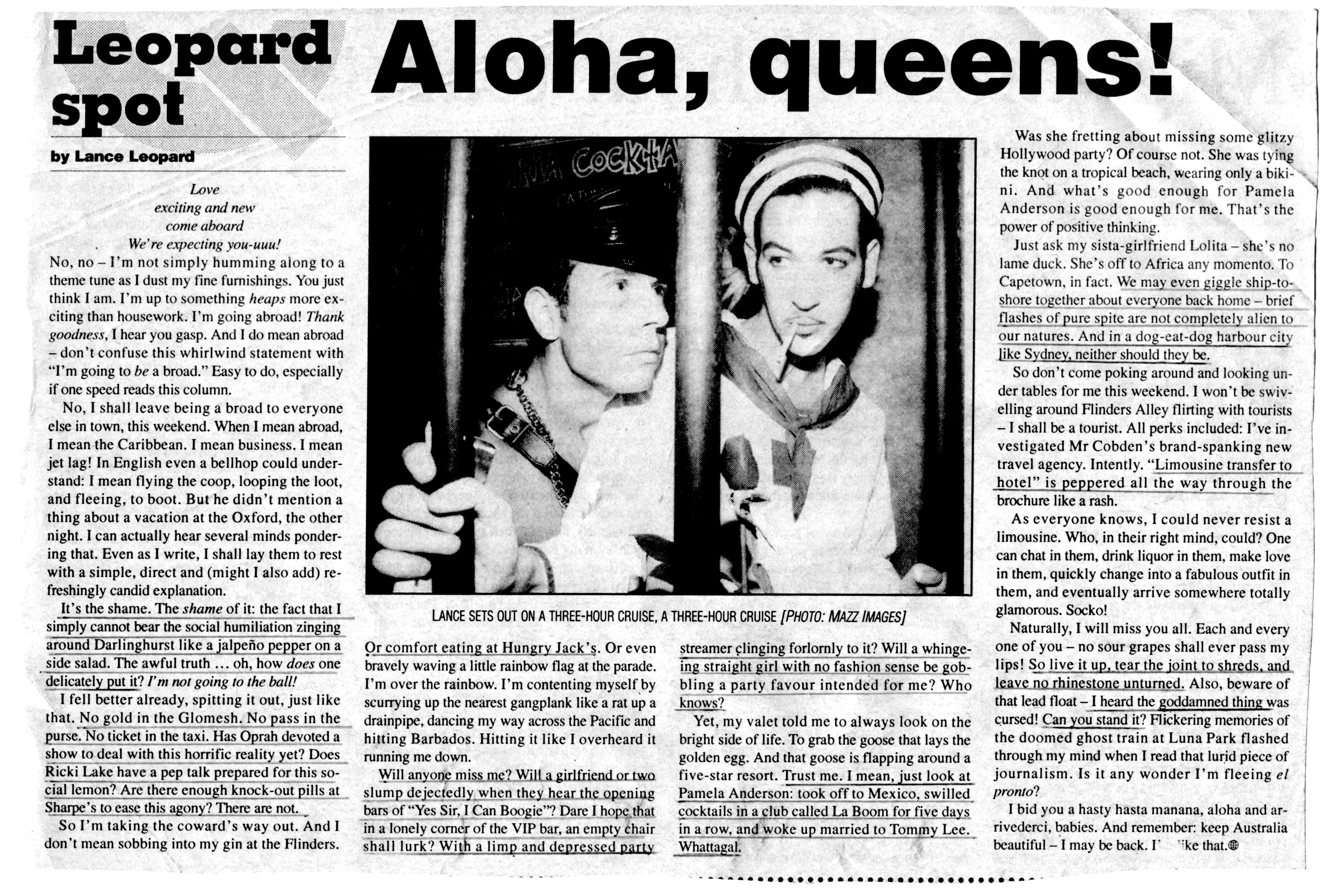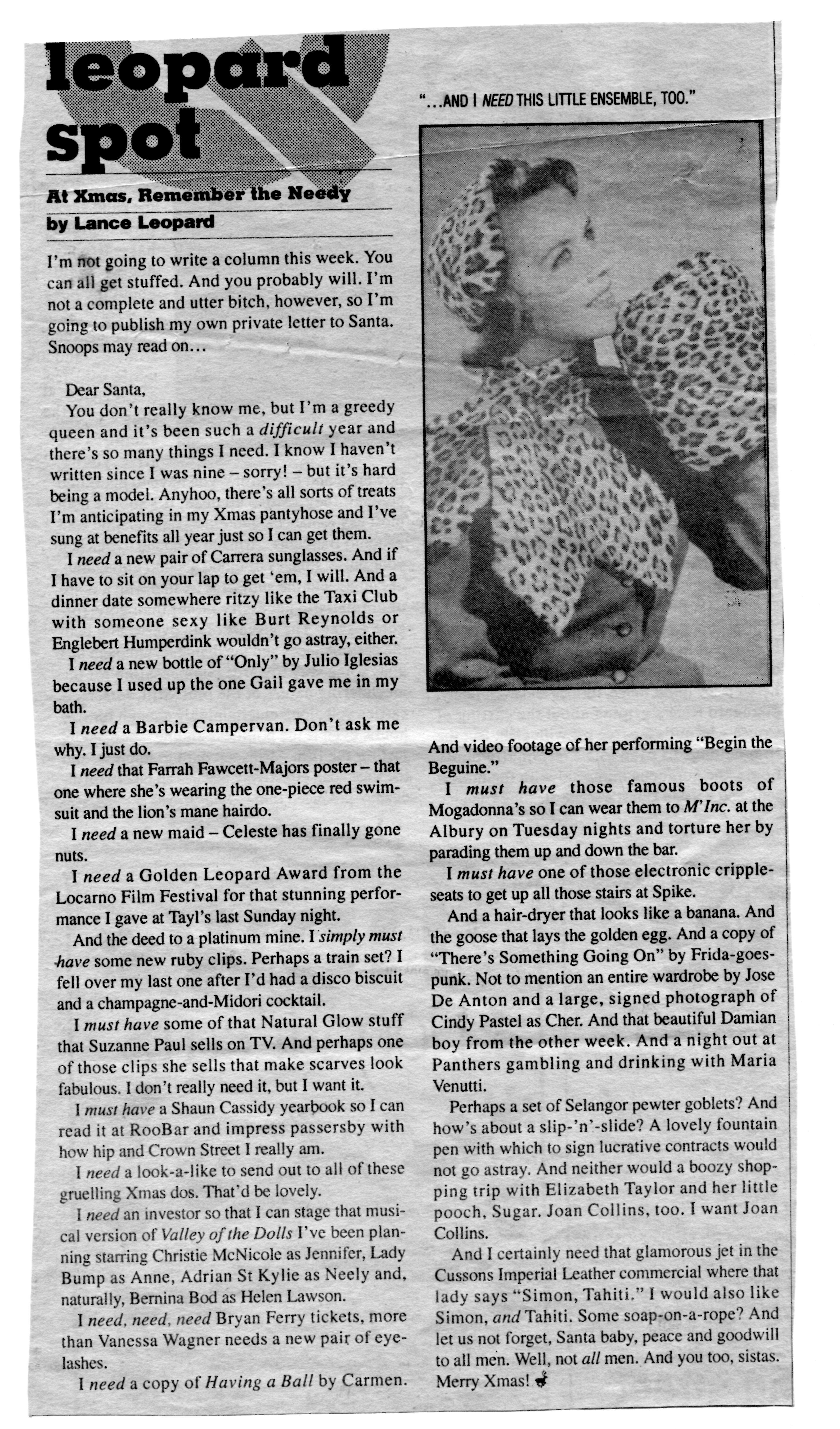 I used to look forward to reading Lance’s columns every fortnight, it was such a highlight. They were in On The Street, Capital Q, the Sydney Star Observer (6 June 1996 to 18 Sept 1997), then back to Capital Q. Â I had been a journalist since the early 1980s and was totally blown away by Lance Leopard’s stream-of-consciousness columns and his chatty style and I cut them out as they were very inspiring. Over time, Lance’s writings gave me a vision of how I could write about the everyday social events I attended. He could make a trip to the convenience store next to the Taxi Club at midnight sound hilarious. He was a witty gossip writer who truly captured the 1990s GLBTIQA+ social scene.